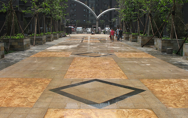園、大型廣場以及室內外主題裝飾等多種景觀環境中都得到了充分的體現,目前擁有高承載透水藝術地坪、彩色壓印藝術地